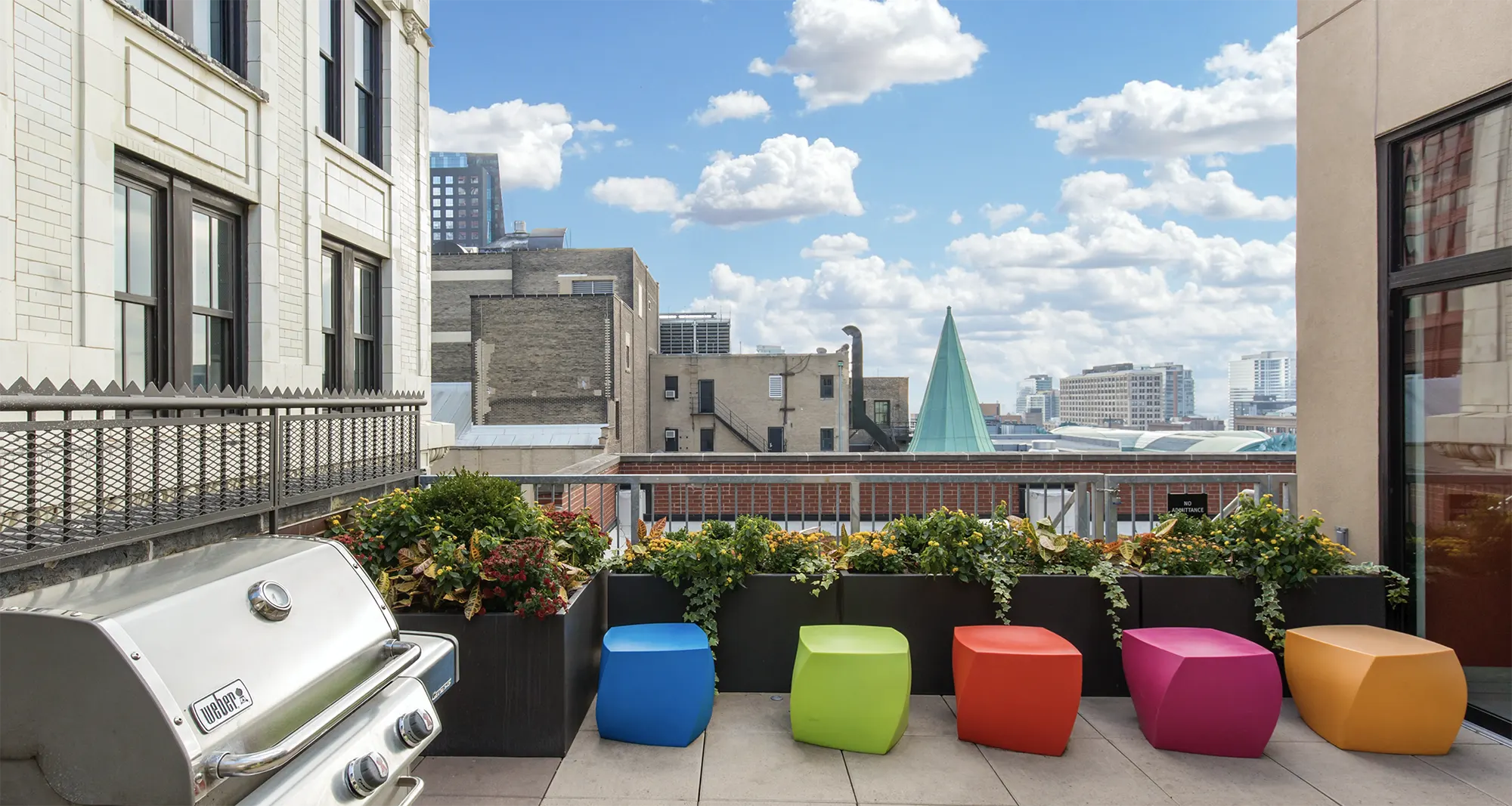 Private, resident patio featuring gas grills and lots of seating. The perfect spot to relax after a long day, or invite your friends for a cookout.